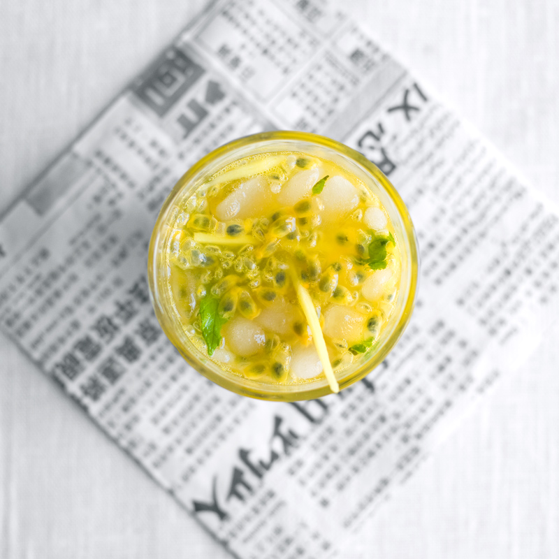 Two summers ago we tried an amazing passion fruit and orange drink with a quite strong taste of mint and ginger on a Vietnamese restaurant in Copenhagen. This is our recollection of that drink.