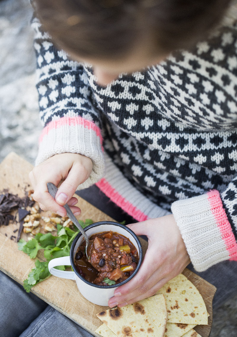 Friday night. Elsa is sleeping. Finally time to write that post we prepared earlier this week. I’ve been looking forward to share this recipe, as I am pretty certain that many of you will like it. This bean chili (or chili sin carne, as David calls it) is not only warm, comforting and spicy. It also has the most wonderful flavor from dark chocolate, coffee, red wine and crunchy walnuts. I seriously can’t think of a more perfect recipe to embrace autumn with.