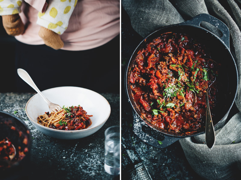 It feels a little weird writing about these comforting and wintery pasta bowls from here, but I’m trusting that Pavarotti will help me with that. It’s summer in South Africa, we’ve got lemon trees growing in the garden, there is a small pool, a cute kitchen and Elsa and Isac are keeping occupied by throwing grapes at each other in some kind of never-ending grape war. In short, we are very happy and grateful to spend a month here. Apart from the children’s fights, the scene is vastly different from two weeks ago when we shot this recipe. Isac had pneumonia, Elsa and Gabriel were snoring with colds and we were all cozied up (or more like stuck) in our Stockholm apartment – pale, tired and gloomy, surrounded by cold winter. The only thing we craved then were simple and comforting pasta dishes like this. Vegetarian bolognese is perhaps not one of our most unique recipe ideas but it is January food at its best, so we thought it might be something you’d also be interested in making.