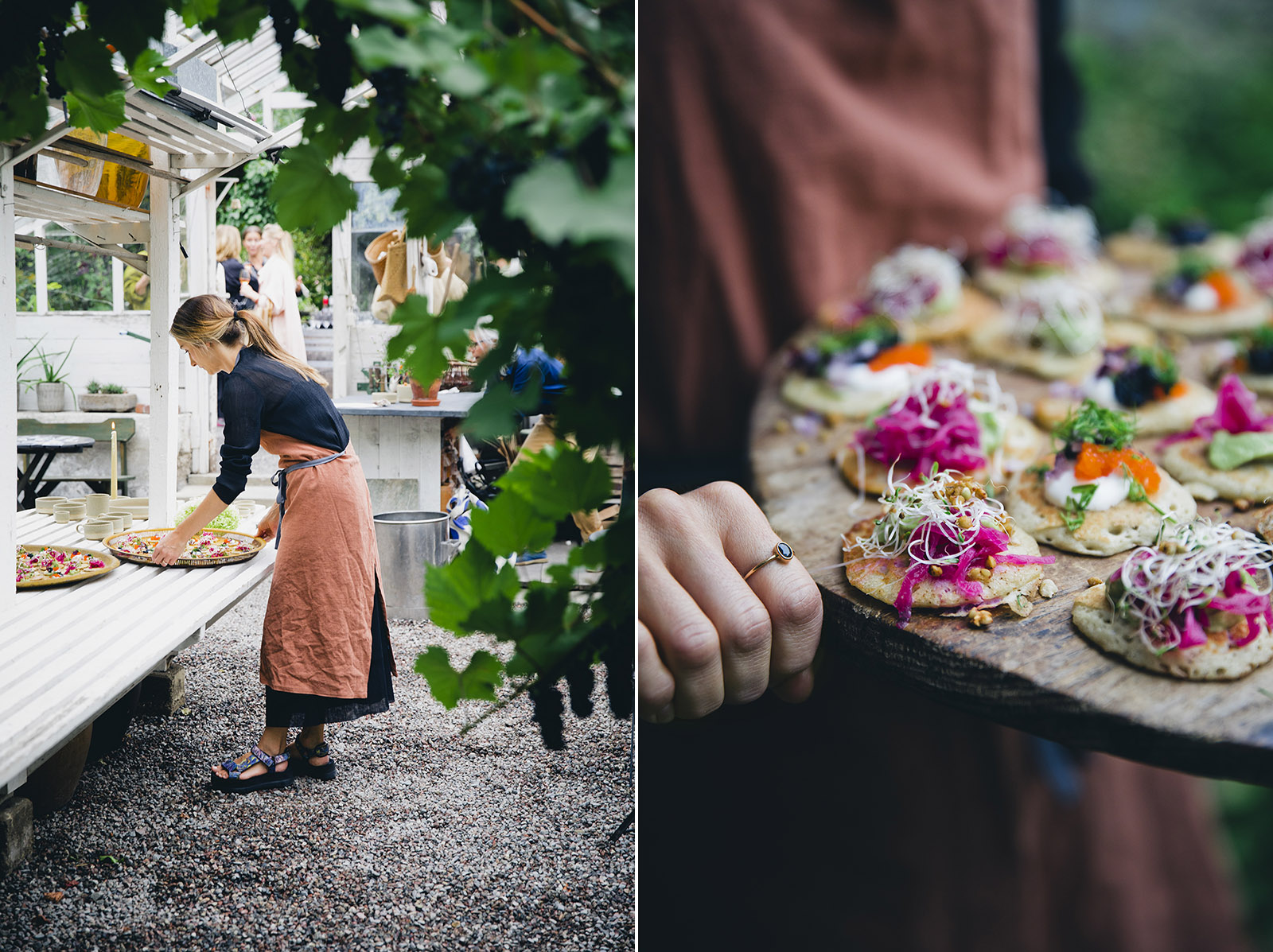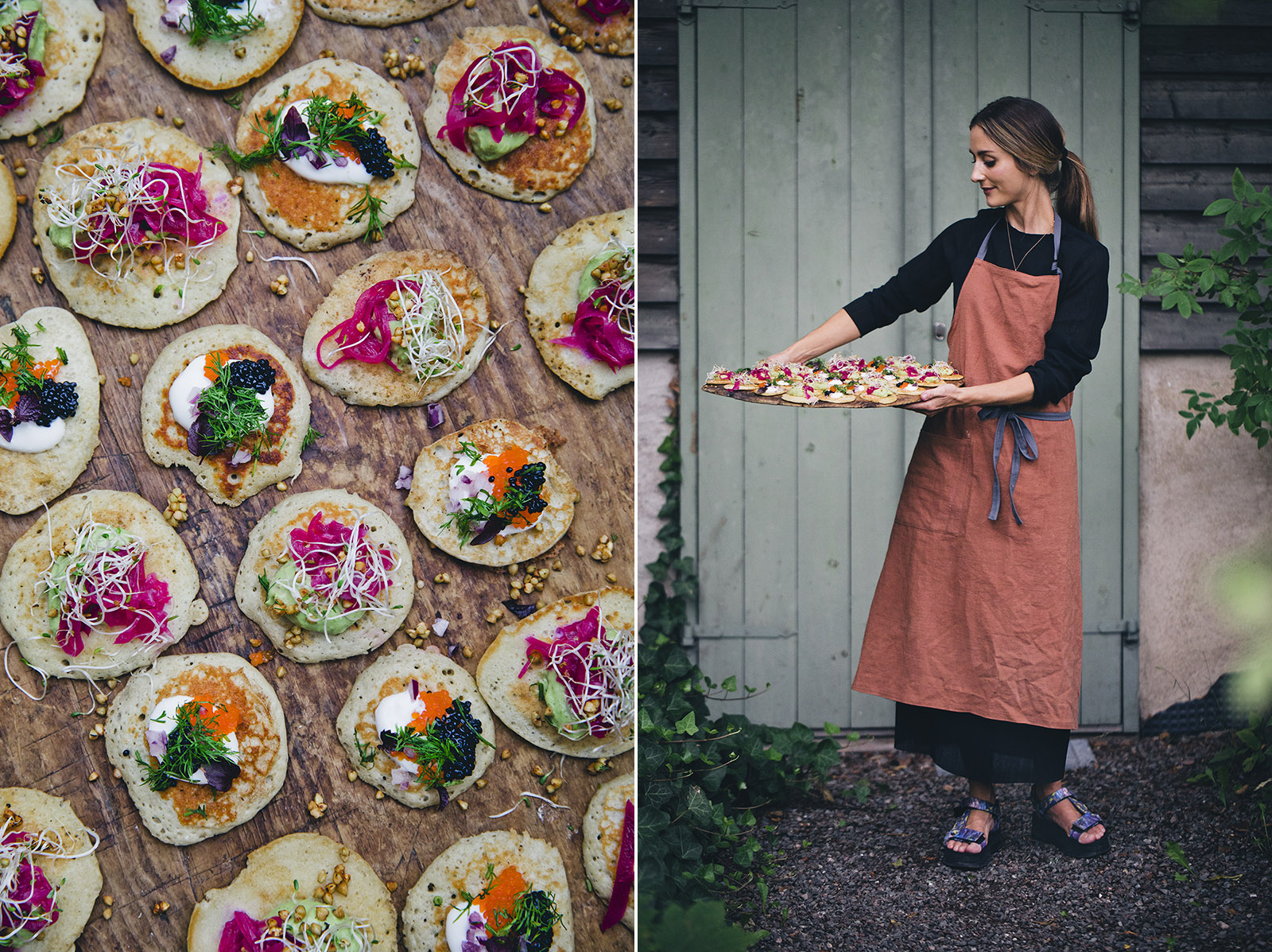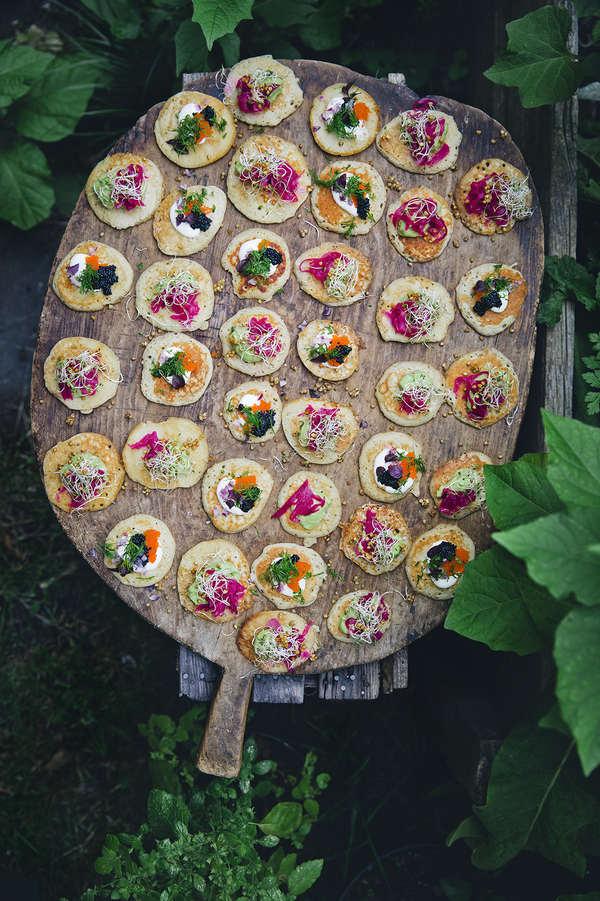 A while back we catered an event for our friends that run the clothing store and brand Grandpa. We don’t usually do caterings so we wanted to cook something simple and mingle friendly that could be handheld and served cold and decided on Blini. If you haven’t tried blini before, they are salty and a little tangy buckwheat pancakes that often are served topped with sour cream, red onion and caviar. We made a gluten-free vegetarian and vegan version with two different toppings for the event and are sharing them both here. The vegan version is topped with avocado cream, mustardy buckwheat crispies, cabbage krauts and sprouts. The vegetarian version looks more classic and is topped with sour cream, vegan caviar and dill. They are perfect party snacks as you can prep a lot quite easily (sure, there is a bit of frying going on but you can prep that in advance and then add toppings later)! They are super tasty and they look impressive and colorful too.