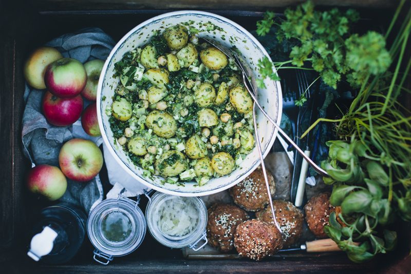 With Isac waking up too early in the morning (night, really), my head has been in a constant haze these last days and the buttons on my keyboard are dancing in front of me when I am trying to hit them. So, let’s immediately get down to business. And with business I mean salad. This simple salad puts our Golden Sauerkraut recipe from last month to good use. With all the fresh produce available this time of the year, bowls like these are on weekly rotation in our home. They are quick to make and easy adaptable to whatever vegetables we have available. Warm quinoa and a fried egg makes this more filling than a normal salad, and tahini, lemon and sauerkraut add flavour. We use a fork to break the egg and stir around so the yolk gets mixed with the other ingredients. Come to think of it, this is almost like a hippie sister to bibimbap. Hippie Bibimbap!