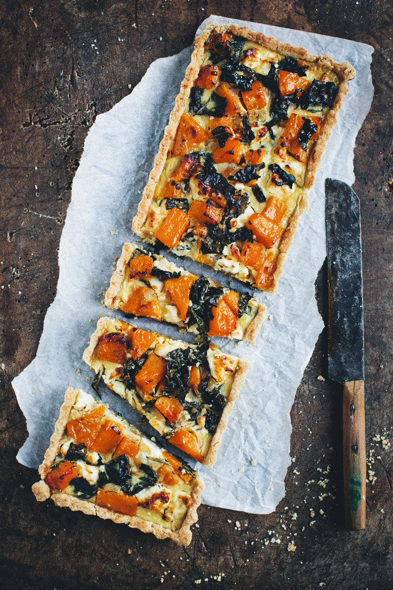 Prepare the filling: Line a baking tray with baking paper. Peel the butternut, discard the seeds and cut into 1 inch / 2,5 cm dices and place on the tray. Drizzle with oil, add the spices and toss to combine. Roast in the oven for approx. 20 minutes or until it starts to brown and soften. Set aside. This step can easily be prepared ahead and stored in the fridge for up to a couple of days before baking the quiche. While the pumpkin is in the oven, heat oil in a skillet on medium heat and stir-fry the onion and garlic for 10 minutes until transparent and soft. Add the chopped kale, stir around and stir-fry for a few more minutes, add the apple cider vinegar and season with salt and pepper and leave for two more minutes. Set aside.