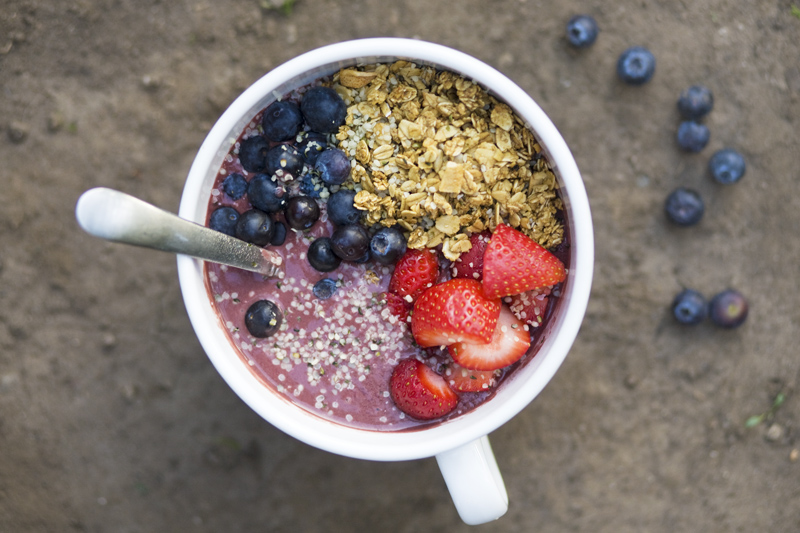 Açaí (“Ah-Sigh-EE”) is a Brazilian superfruit berry, it grows on palm trees in Central- and South America. If you live in California you’ve probably seen/tried this kind of bowl before, since you can find Açai cafés in most big cities, but you might not have tried to make it yourself? Don’t try to chase down fresh or frozen Açaí berries, like I did, you won’t find it (except for in the amazons). They only come as frozen pure, juice, dried or powdered. In this recipe it’s probably easiest to use the frozen pure. It tastes like a mix between bitter chocolate and blueberries and is the fruit on earth with the highest content of antioxidants.