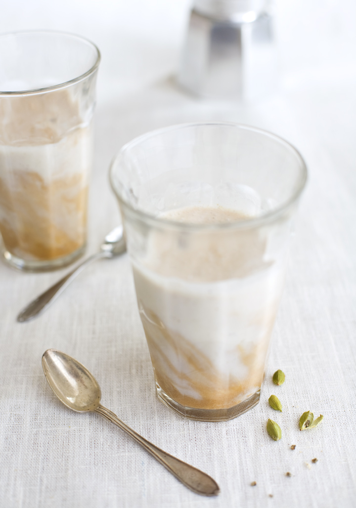 When we lived in Italy we fell in love with all their different cold coffee drinks, unfortunately they were all jammed with sugar and cream. Now we have tried to recreate that summer coffee feeling. We replaced the sugar and cream with coconut milk, rice milk and a banana, which makes the shake rich, creamy and sweet. We gave it some extra taste with cardamom and hazelnuts. Enjoy it in the sun!