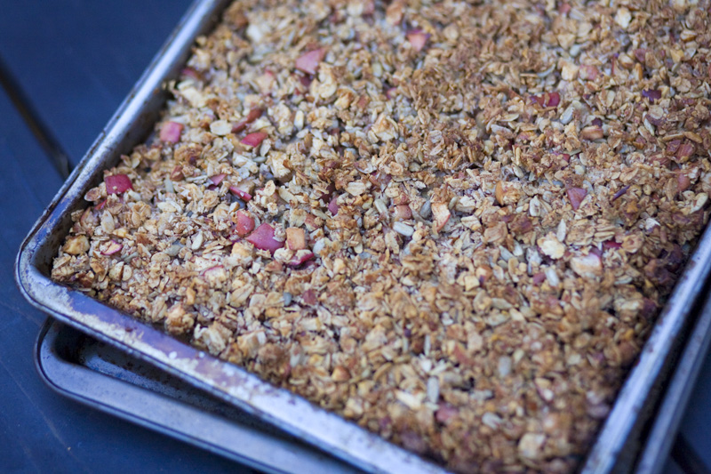 Mix all the dry ingredients in a bowl. Add apples, maple syrup and coconut oil and work it together by your hands to a sticky crumble. Grease a baking tray with coconut oil (or use baking paper). Flatten the crumble out on the tray in a thin layer and bake, next to the pan with the crabapples, for 15-20 minutes or until golden and crispy.