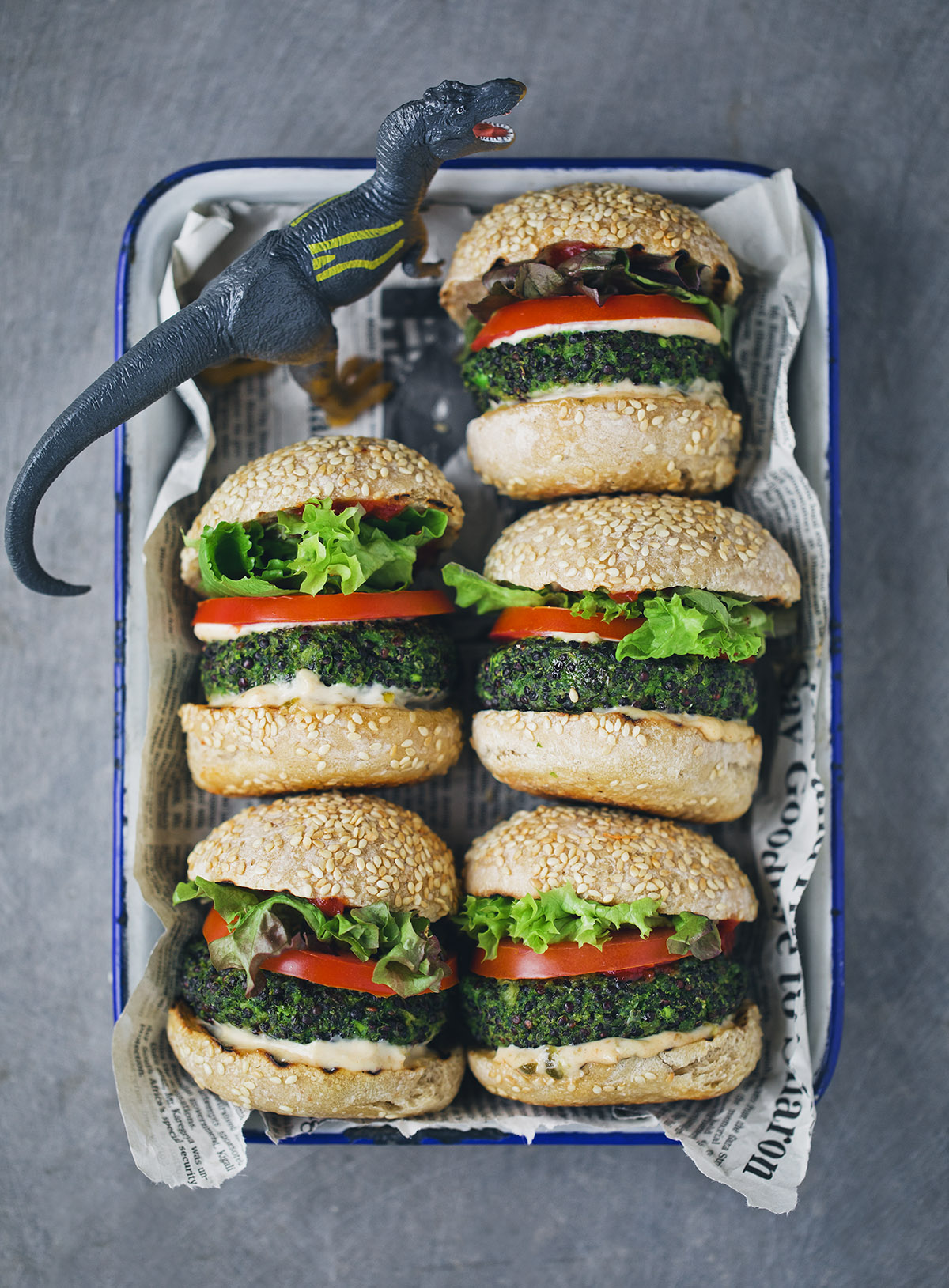We are also sharing a popular recipe from our Little Green Kitchen book. It is a pretty simple mini burger packed with spinach and quinoa and yet with a round sweetness from green peas, oats and cheese. We call them Dino Burgers because (A) It's a fun name, (B) it's a reminder that this type of food makes you strong, and (C) because we imagine that the prickly quinoa texture looks like dinosaur skin and that proofs that many dinosaurs ate quinoa ;)