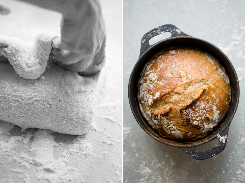 Baking isn’t normally our strongest area, so when we succeed with three breads in one day, it must be a fail-free technique. We love sourdough bread, but ever since our sourdough starter tragically past away, we gave up the thought of making our own again. This recipe has however the flavor and texture of a sourdough without the need of a starter. This is thanks to the long fermenting process. The fermenting also spares you from kneading it, time does all the work. One trick to succeed is to get the pot really hot. So when you add the wet dough, it’ll create a moist and steamy environment that gives the bread that perfect crust.