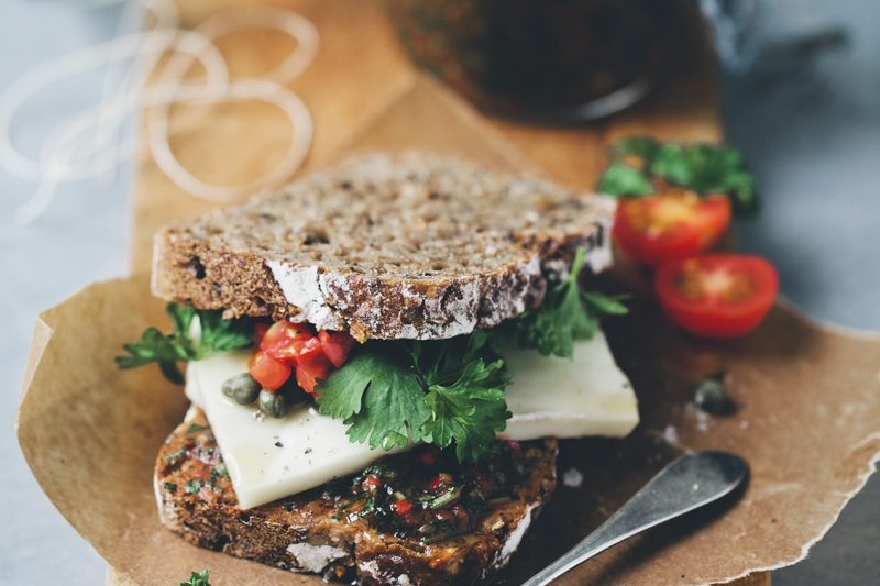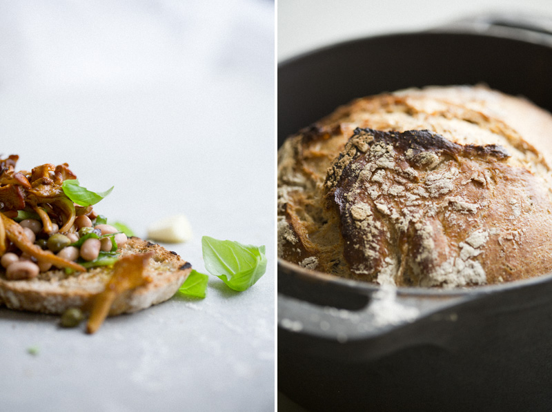 Chanterelles are very popular here in Sweden during August and September. Almost everyone I know has their own secret spot in the forest where they claim chanterelles grow like a yellow carpet. We don’t have any secret places like that. So when we can’t tag along some of our friends, we just go and buy a large bag of them at the market. One of the simplest yet most delicious way to eat chanterelles is stir-fried on a sandwich. So for dinner, we combined that Swedish chanterelle sandwich with a recipe for an Italian bean bruschetta that we sometimes make. The result was great. The beans added creaminess and tanginess and made it more into a dinner than just a sandwich. So, next time you feel like making a bruschetta, skip the tomatoes and try this bean and mushroom combo instead. We have included the recipes for both the bread and the bruschetta here. Happy weekend!