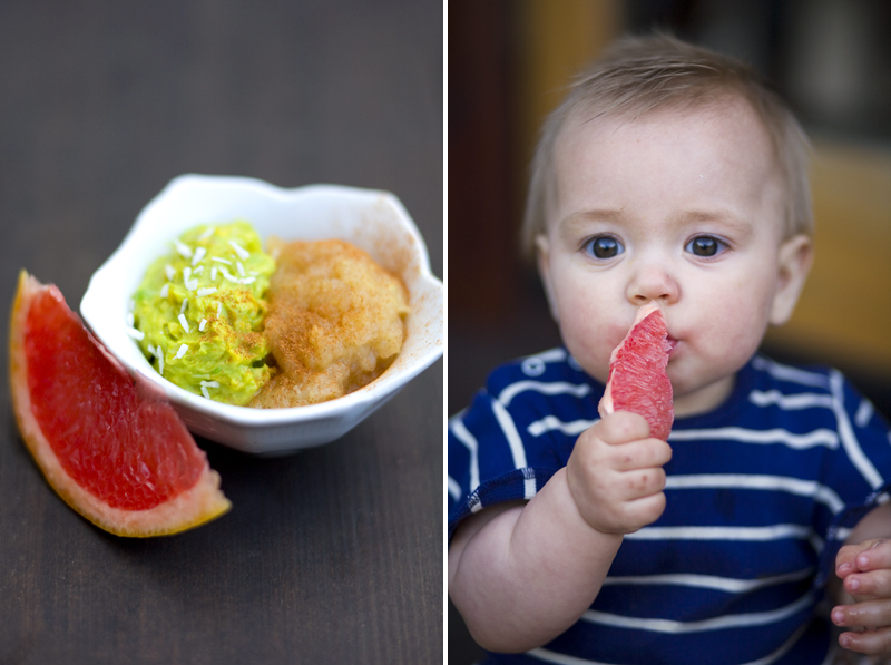 We want to keep her off ice cream, candy and cookies as long as we can. Right now she is more than happy with a scoop of cinnamon applesauce, a coconut avocado mash and a slice of grapefruit to chew on.