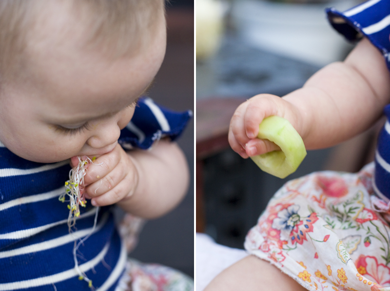 Her absolute favorite food is – believe it or not – Sprouts! They are easy for her to grab, put in her mouth and to play with. Even though most of them ends up on the floor they can keep her occupied during a whole meal. Which gives us time to feed her these other dishes (and to eat ourselves). If we don’t give her sprouts we make sure that she always has something to hold on to and play with while she eats, like this cucumber ring. Use the cucumber ring instead of teething biscuits, homeopath say cucumber has amazing ability to act as a pain reliever, so cool!