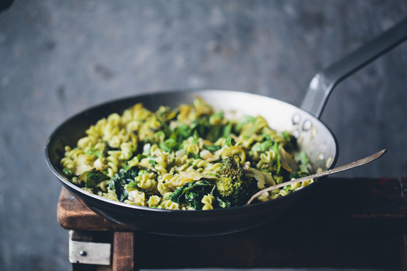 We always feel quite content after having published one of those type of recipes. But it actually seems like the recipes from simple fridge and freezer findings that are whipped together quickly without a moment of planning, seem to spark just as much interest, even though they are very basic. This quick pasta dish with fifty shades of greens started out like that, with two hungry kids, half a package of pasta (made from legumes) and some leftover green vegetables (the ones on the photo obviously look a little less sad than the first time we made it). It ticks all the right boxes for a February recipe. Simple. Comforting. Nutritious. Vegan. Tasty!