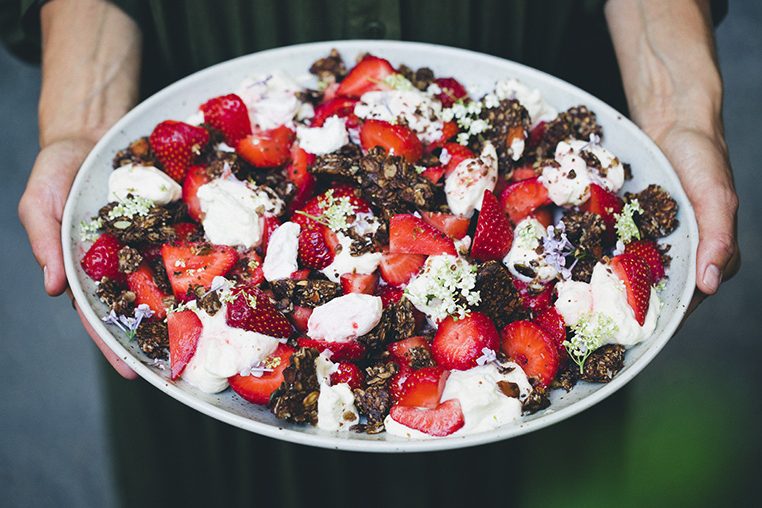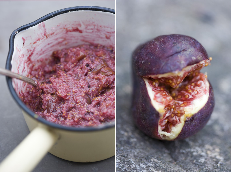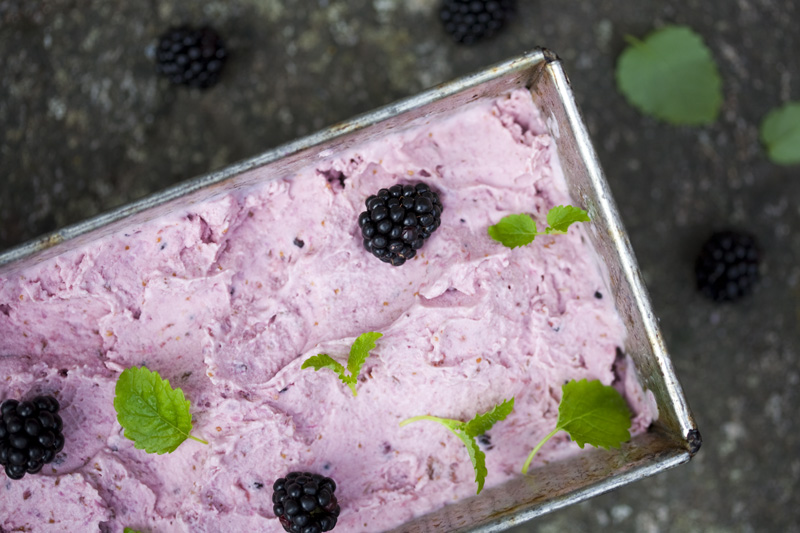 Start by removing the ends from the figs. Cut each fig into 8 pieces. Put them in a saucepan, add water, lemon zest, coconut flakes and ginger. Cook over medium heat, stirring occasionally, for about 10 minutes until the figs are tender. Add honey and around 10 blackberries. Continue to cook for about 15-20 minutes (you might want to lower the heat a bit) until it reaches a jam-like consistency. When it’s done, remove from the heat and let cool to room temperature. Use an immersion blender or food processor to quickly mix it together with the coconut milk and lemon juice. Don’t mix too hard, it’s nice with some fruit pieces here and there. Chill well in the fridge (otherwise you will have yourself a fig milkshake, we have tried that…) before you put the mixture in an ice cream maker for about 25 minutes or however long your brand of ice cream machine suggests. Serve with fresh blackberries and a few leaves of fresh lemon balm.