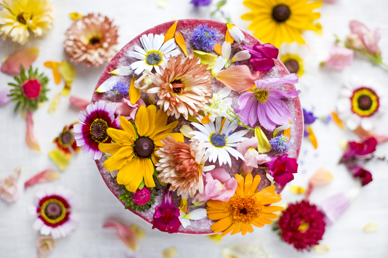 Edible flowers: Viola-type flowers, Calendula, Roses, Rosehip, Dandelions, Carnations, Lavender, Cornflowers, Pea flowers, Day Lilies, Chamomile and many more.