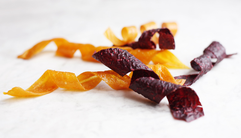 They are done when the puree isn’t sticky anymore, you normally need between 5-8 hours depending on the oven (if the temperature is higher they will be done in less time, but there is a risk they get burnt and too dry). Use a scissor to cut them and roll them when they are still warm (we used a pencil to get the right shape).