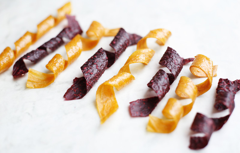 One of the things that we have been talking about trying since we started this blog is Fruit Rolls. You know those sticky candy rolls that you buy just when you thought you were done shopping in the supermarket. They usually contain gelatin, preservatives and a whole lot of sugar. After a quick recipe search on the internet it seems like that doesn’t have to be the case. Just using fruit is actually enough to make candy in all kind of shapes and colors. In contrast to our seven-minute-sweets, this candy is more of a seven hour thing! Making them is actually quite simple but they need a long time in the oven on the lowest temperature possible. We decided to make two different kinds, yellow (mango, apricots and oranges) and red (raspberries, blackberries and bananas), they both tasted great!