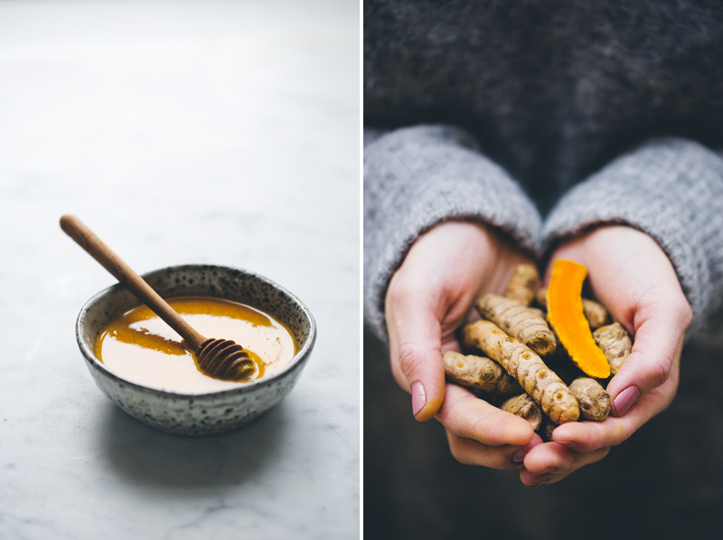 Yesterday Luise took the very same ingredients that I used for my caramels and instead created this immune boosting honey. It is filled, not only with a very large chunk of fresh ginger, but also turmeric, lemon and some black pepper. We call it Bomb because it hits you like one, but it’s really just a flavored honey. It tastes incredible in tea or just on it’s own, dissolved in hot water. It would probably also be pretty nice to use in cooking or on a piece of bread. I have been adding a large spoon of this in a cup of peppermint tea and am already back to my normal medium-weird myself, so this stuff really helps.
