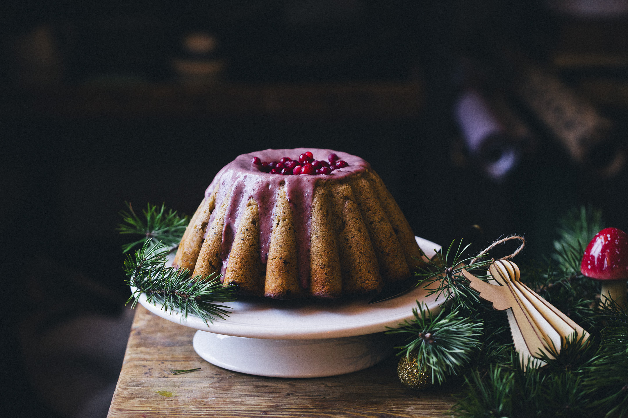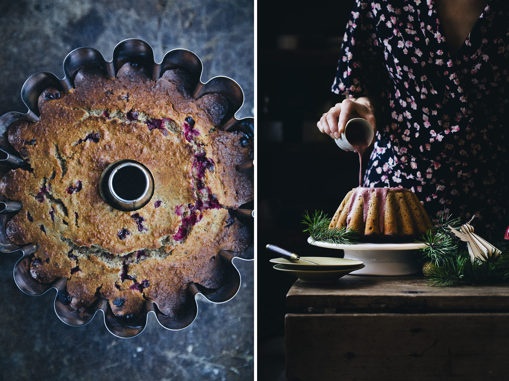 It’s a gluten free, spice heavy, bundt cake with a touch of sweet banana bread. Very soft and moist and very, very good. We add tangy nordic lingonberries to the cake and the glaze to give it a pop in flavor and color but you can leave them out if you like. Or replace them with other berries like cranberries or raspberries. The glaze is rather untraditional, made on dates, plant milk, coconut oil and berries. It doesn’t shine as the ones made on sugar but super delicious nevertheless. Perfect if you are trying to keep the sugar down. You could of course add any glaze of choice to it.