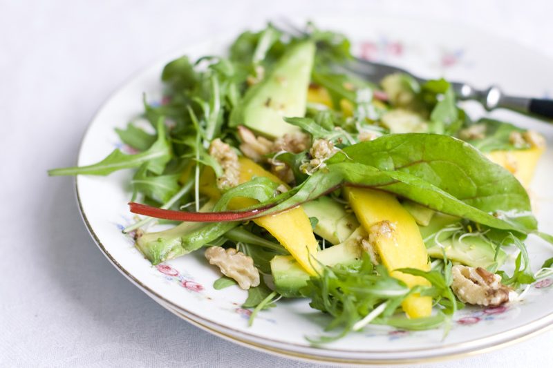 Make the batter and fry the pancakes if you haven’t done so already. Place two slices cheese in the middle of each pancake. Spread a layer of mustard on the cheese, slice the tomatoes thinly and lay them on top of the mustard along with a small handful lentils. Fold the pancakes into quarters and place in a baking dish with a drizzle of olive oil on top. Bake at 200°C/400°F for 10-12 minutes or until the cheese has melted. Meanwhile, chop up lettuce, avocado, melon and cucumber and place in a salad bowl. Add the remaining lentils. Drizzle with olive oil, balsamic vinegar, salt and pepper and toss. Serve the pancake warm with salad on the side.