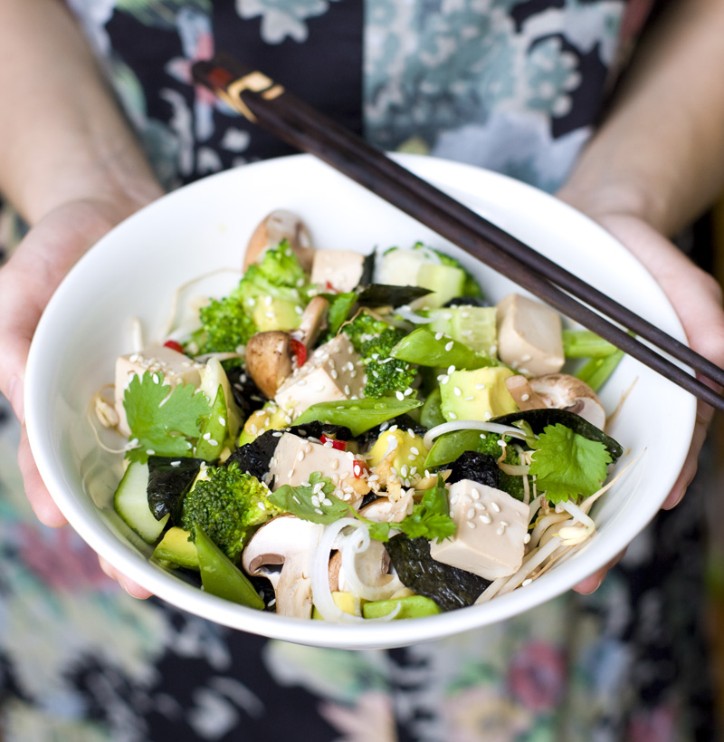 This is what happened one day when we felt like making our own vegetarian sushi but were too lazy to go through the whole Japanese rice and rolls procedure. Instead we marinated tofu, boiled some brown rice, chopped our favorite vegetables, cut the seaweed into pieces and turned sushi into a salad. And what a salad! The sesame oil, rice vinegar and seaweed gave the salad that sushi feeling, although with a more nourishing twist. We quickly realized that this dish actually had made it to our top-list of favorite dinner recipes (right next to our Lasagna and Quinoa & Kale salad).