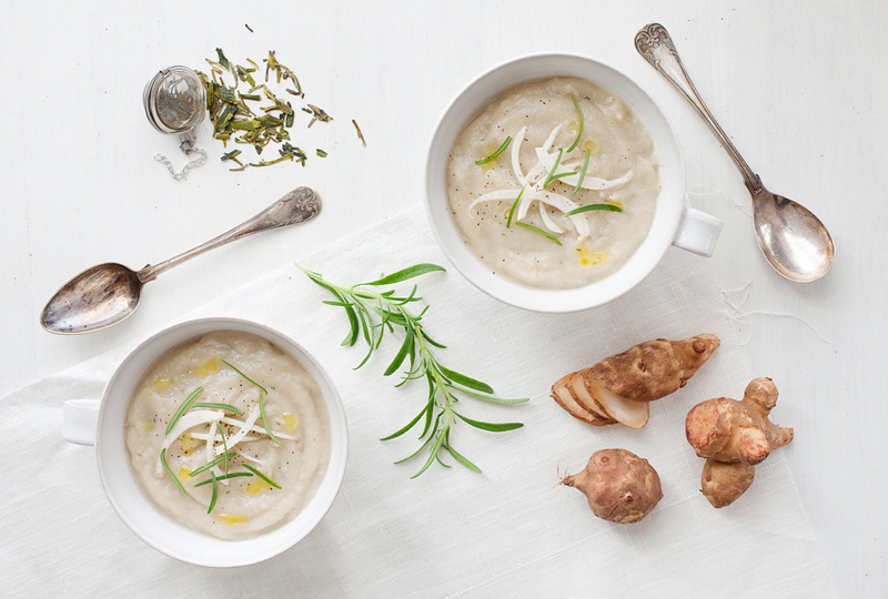 What is so great with sunroots is that they are very nutritious. They are a good source of iron and they don’t contain regular starch, like potatoes for example do. They dissolve easily when boiled and have a sweet and a nutty taste, which makes them the perfect soup vegetables. A lot of sunroot soup recipes call for heavy cream, we left it out to make it lighter, and also because the vegetables alone are enough to make this soup creamy.