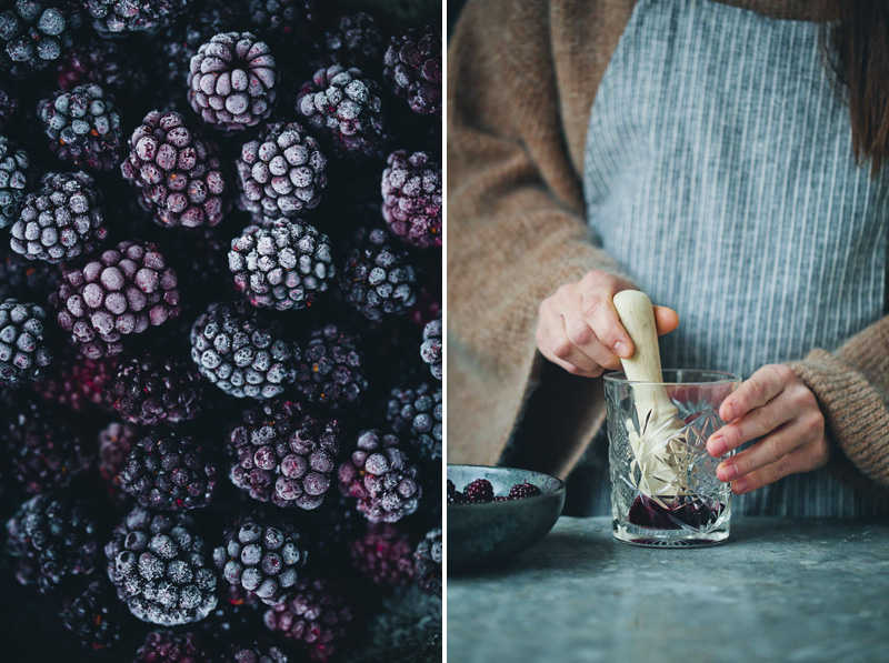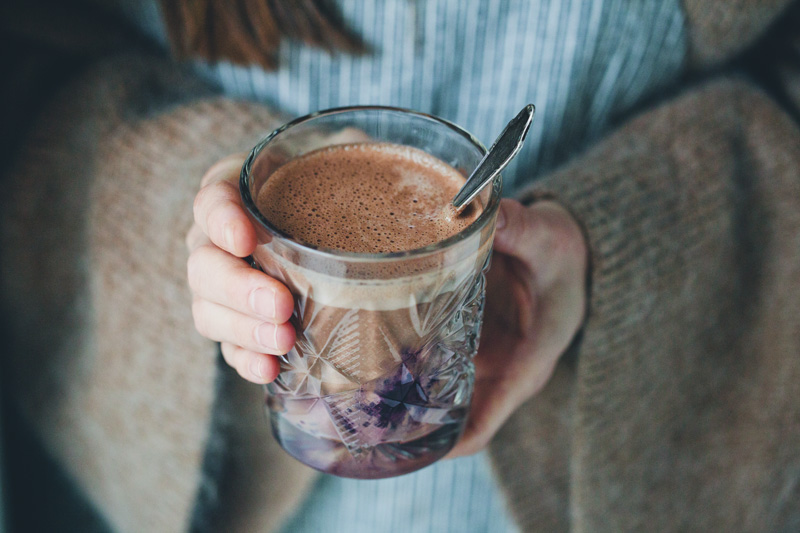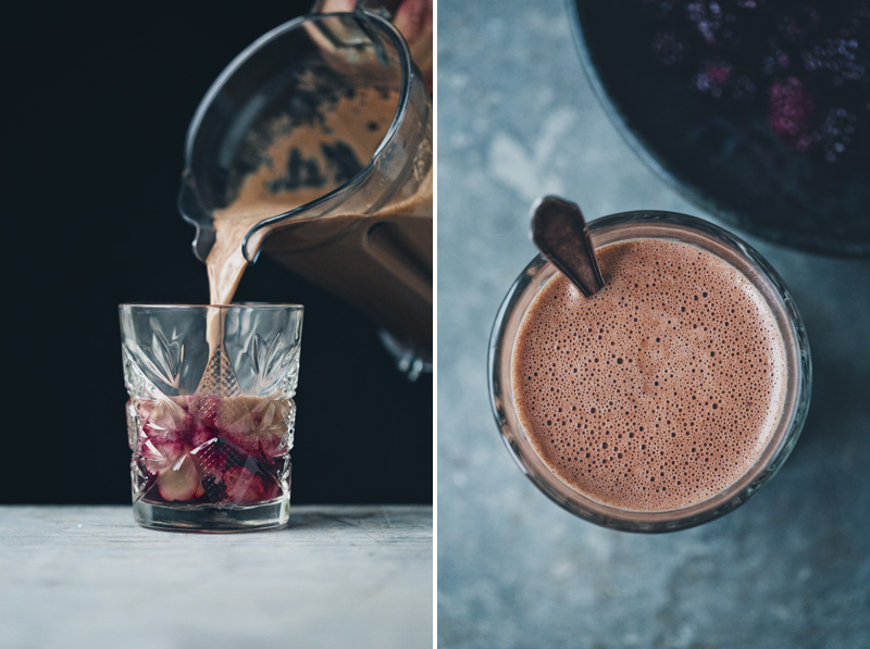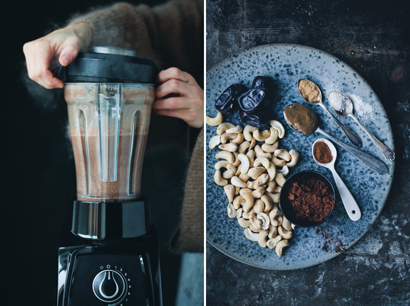 We’ve had intense snow falls and cold days here in Stockholm for the past week. A weather that calls for furry sweaters, warm soups, spicy stews and large cups of hot chocolate. Our favourite chocolate recipe is thick, rich, creamy, vegan and insanely delicious. And we are sharing it here today, along with a competition to win a Vitamix blender (further down in this post). We actually make our chocolate directly in the blender, which not only saves dishes but also makes it perfectly frothy. This recipe is based on one of the recipes from our smoothie book, but we have adapted it slightly for our current mood. We have also added a few mashed blackberries to each glass/cup before serving, for a bit of complexity and a hint of berry flavour (which work really well with chocolate). This is of course entirely optional in case you are a hot chocolate traditionalist.