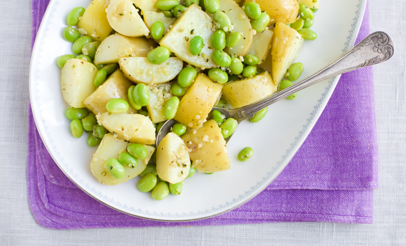 Boil the potatoes and set aside. Boil some water and pour it over the frozen edamame beans, let them soak for a couple of minutes and then remove the shell. Mix the marinade and cut the potatoes in medium size pieces. Mix potatoes, edamame beans and the marinade in a bowl and serve on a big plate, or bring it in a picnic-box!