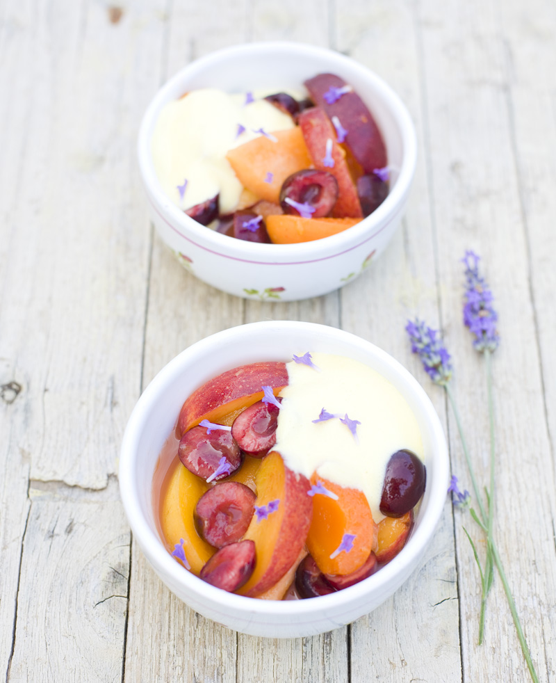 To serve, divide the fruit in 4 glasses or small bowls. Put a spoonful of zabaglione alongside. Sprinkle a couple of lavender flowers on top of it.