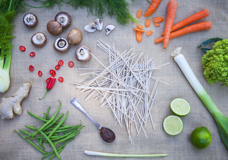 Preparing the vegetables: Finely slice the chili, mince garlic and ginger, cut the lemongrass in half and “bruise” it with the bottom of your chef’s knife. Finely slice leek, carrots (use a peeler) and divide the Romanesco into small pieces. Cut the brown mushroom into quarters, slice the fennel bulb and chop the fennel greens. Trim the green beans by removing the top stems.