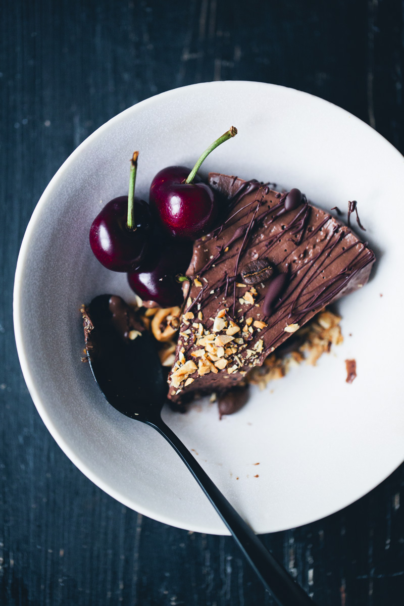 Come to think of it, this must be one of the easiest cakes in our repertoire. It’s entirely vegan and gluten free, the ingredient list is conveniently short and you can throw everything together in more or less 15 minutes. Although it needs about two hours in the freezer before it can be devoured.