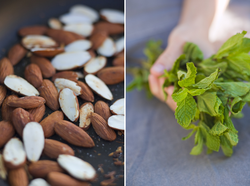 Cook the quinoa according to the package but add one tbsp cinnamon in the water. When it’s done cooking, rinse and set aside to cool off. Squeeze the juice from half a lemon and add five tbsp of olive oil into the quinoa. Chop half of the mint leaves, half of the cilantro and all the raisins, throw them in the quinoa and toss it around until everything is mixed. Serve in bowls together with the marinated vegetables, avocado, spring onions, the rest of the mint and cilantro and the roasted almonds.