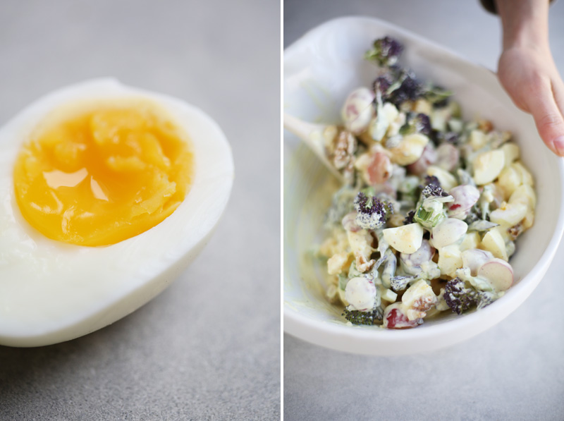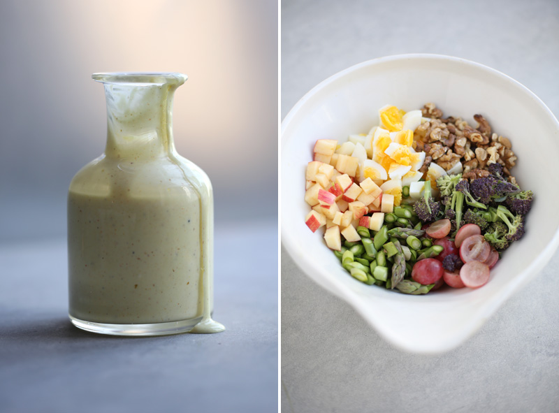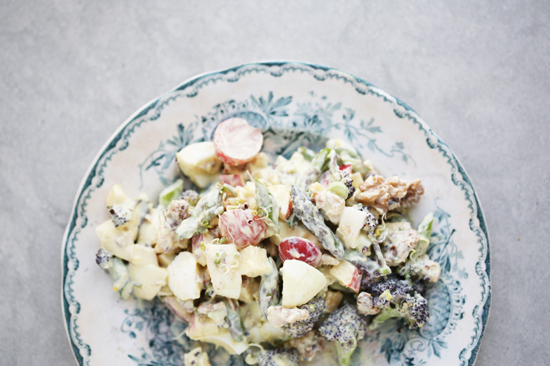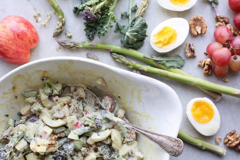 We wanted to infuse spring, so we have added asparagus, fresh broccolini, walnuts, sprouts and some fruit for sweetness. And we replaced most of the mayo with a thick yogurt. The result is so good. Full of flavor and crunch. Serve it on a piece of cabbage lettuce, with a salad, as a side dish or as the Danes; on a piece of dark rye bread. Velbekomme!