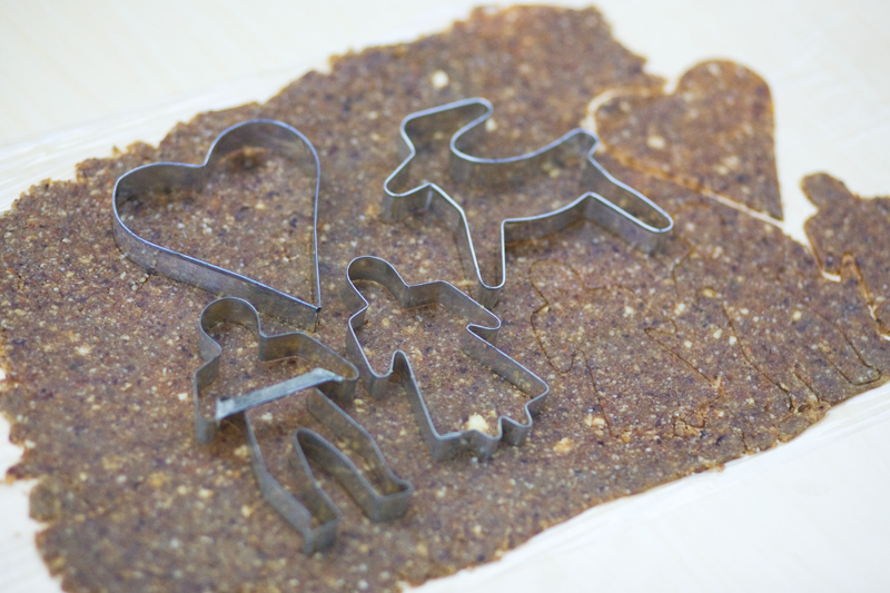 Grind the almonds into a fine flour in a blender or a food processor. Add dates, oil, maple syrup and spices and pulse until everything is mixed into a sticky dough. Sift together flour and baking soda and start kneading the flour into the dough, little by little. When you can form the dough into a round moist ball that doesn’t stick to your fingers, the dough is ready. Put it in the fridge over the night or for at least three hours.
