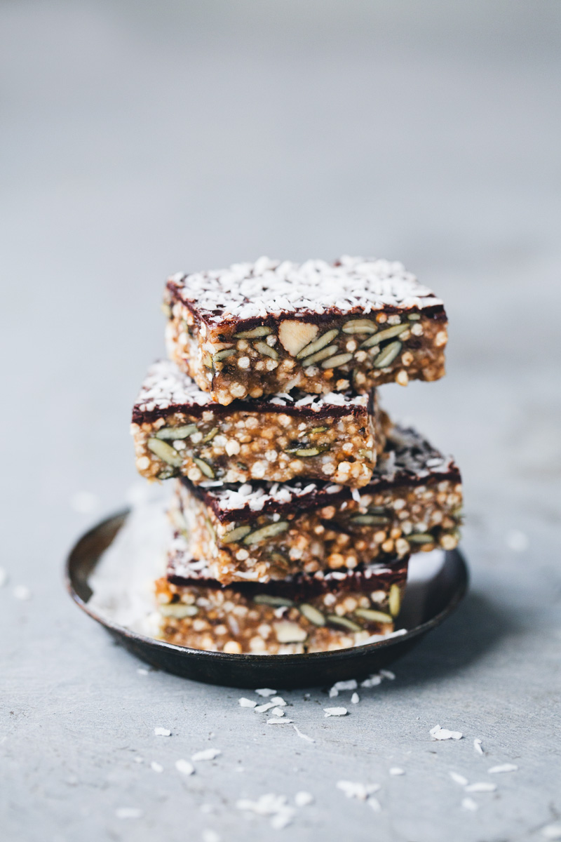 Line an 8 x 10 inch / 15 x 20 cm baking dish with parchment paper and scoop the batter into it. Use the palm of your hands to press everything together tightly into an even rectangle, roughly 2/3 inch / 2 cm high. Put in the fridge or freezer while melting the chocolate on a double boiler / water bath. Pour the melted chocolate over the bars and use a spatula to distribute it evenly. Sprinkle with desiccated coconut and put back into the fridge or freezer until cold and firm. You can store the bars in the freezer and they will last for months or in the fridge if you plan on eating them within a few days. We prefer having them in the freezer and eating them just slightly thawed but still chilled.