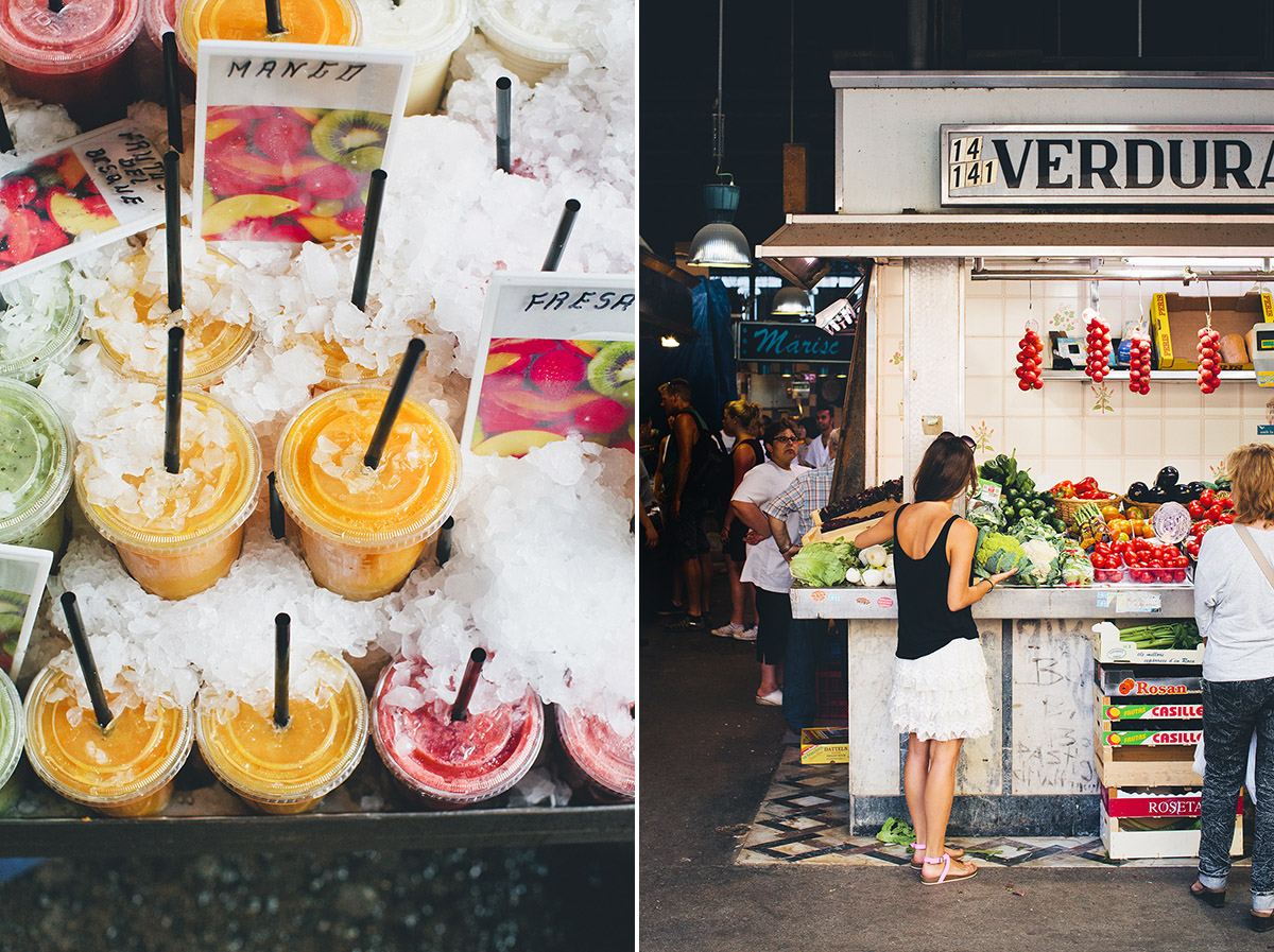 – La Boqueria – The classic market in Barcelona filled with colorful and creatively displayed fruit and vegetables, (sweetened) fruit juices, nuts, cheeses, restaurants (and meats)
