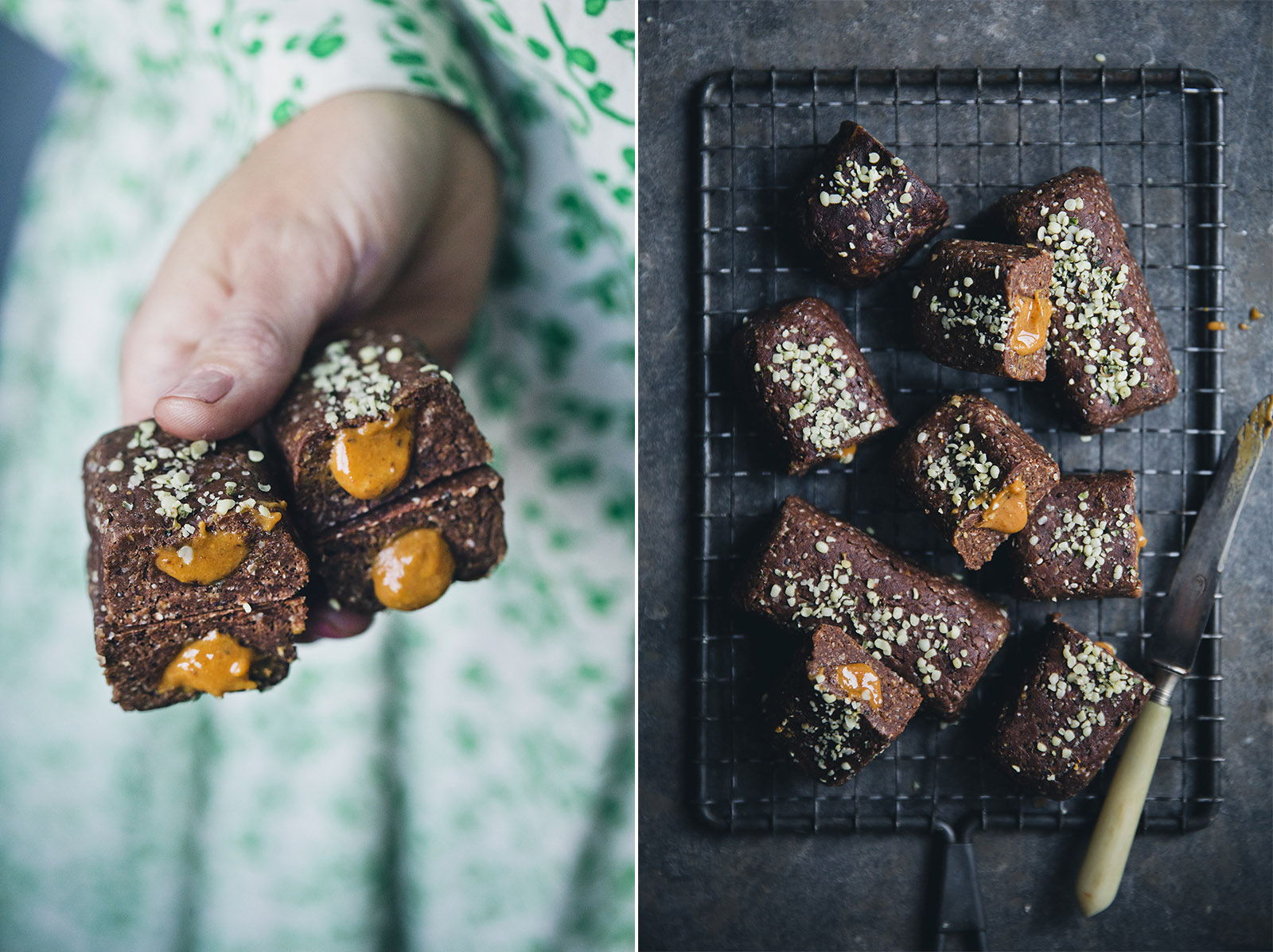 9. Sprinkle with hemp seeds, cacao nibs or flaked coconut and place in the fridge or freezer to firm up. They can be a little tender at first but will quickly firm up when chilled.
