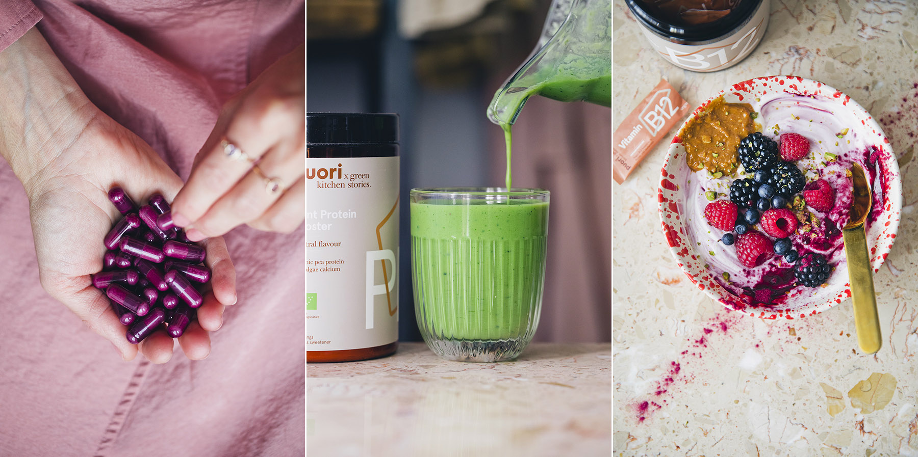The collaboration started with a conversation about how many people are shifting to eating more plant based food and how we can help cover any nutrient gap or deficiency you might experience when on a plant based diet. The most important part is of course to always try eating a variety of vegetables, fruit, pulses, whole grains, nuts, seeds and other whole foods. Eating balanced, exercising and getting enough sleep are key factors for feeling well. But just like most of you, we know that every day isn't perfect and we don't always eat and live as balanced as we intend. There are also certain vitamins that can be hard to absorb naturally these days. Therefore we see supplements as a helpful complement to make sure we get all the vitamins and minerals we need. There are three products in this range and we are really proud of them all. Not only are they very high quality, easy absorbent and clean, but we of course also had to make them prettier than any other supplements out there.