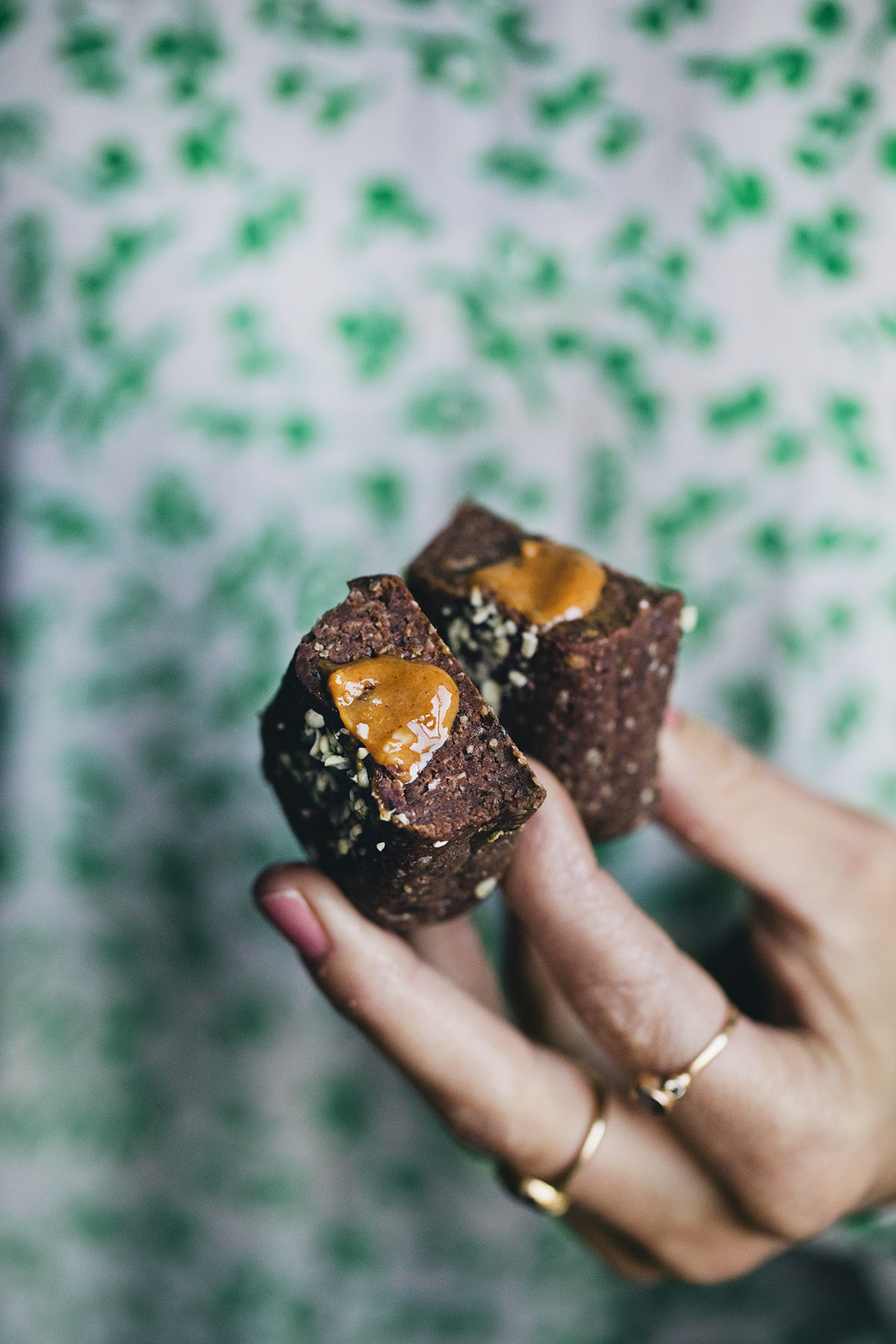 Two fun things! First, these brilliant little protein bites with peanut butter pockets in the center. They are such a treat and even if the process of filling them with nut butter is a liiiittle fiddly, the reward of a biting into a center of runny peanut butter mixed with cacao nibs is totally worth it. I always feel like traditional bars can be quite heavy, but a pocket somehow makes these feel a lot lighter and tastier. In the process of testing them we have filled our freezer and going to the gym has now become an excuse to bring one of these little bites in our gym bags. To make the base you only need a few ingredients; Dates, oats, cacao powder, coconut oil and a good protein powder. Which leads us in to the other thing we wanted to share. Scroll down!