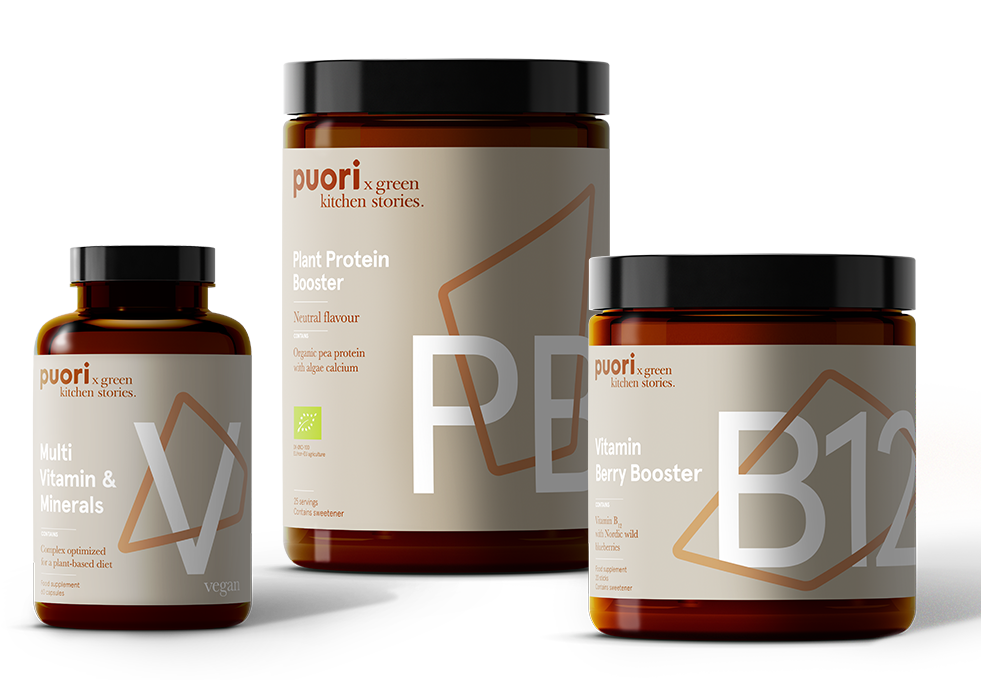 For the past year we have secretly worked with Puori on a new line of vegan certified supplements. A very special B12 Berry Booster, a Multivitamin and the organic Pea Protein Powder (with added calcium) that we have used in this recipe. Puori is a Danish supplement brand that Luise has used and been a fan of for years. They produce some of the cleanest and most high quality supplements on the market and are part of the clean label project.