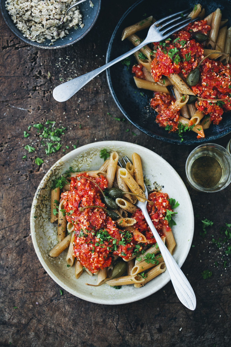 When the tomato sauce is ready, stir in 2/3 of the “tuna”, saving the rest for serving. Divide the pasta in 4 bowls, top with tomato sauce, capers, fresh parsley and a drizzle of olive oil.