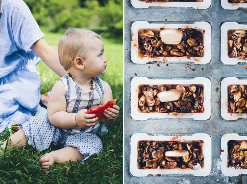 And now, ice pops! Watermelon is doubtless Isac’s favourite fruit so we made these popsicles as a little treat for him. Just like with Elsa, we are trying to teach him to eat proper food before introducing cookies and real sweets. So these are perfect as it’s basically just frozen smoothies. Popsicles or paletas are super simple to make and can be varied in an infinite amount of ways. Here we have blended watermelon as one layer and bananas and yogurt as the other, mixed them a bit to create a marble effect and then added a little chocolate crumble for extra birthday glamour.