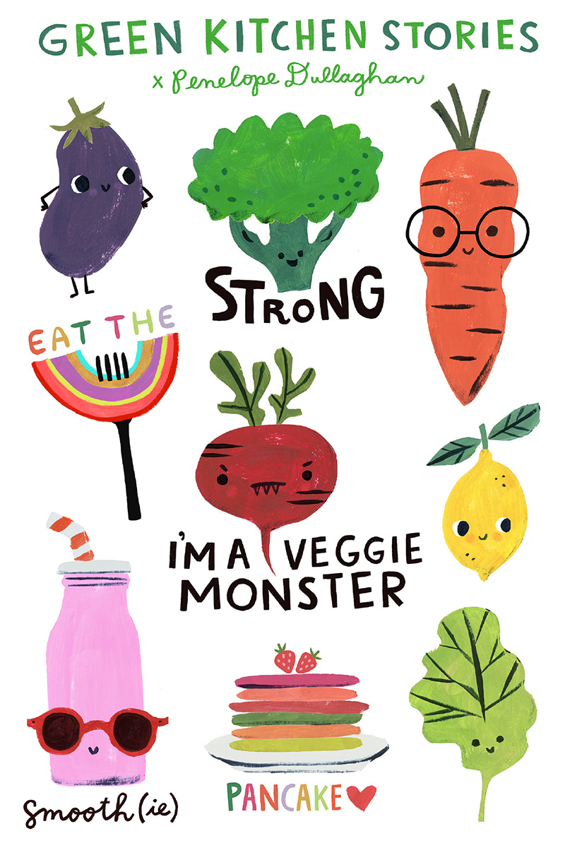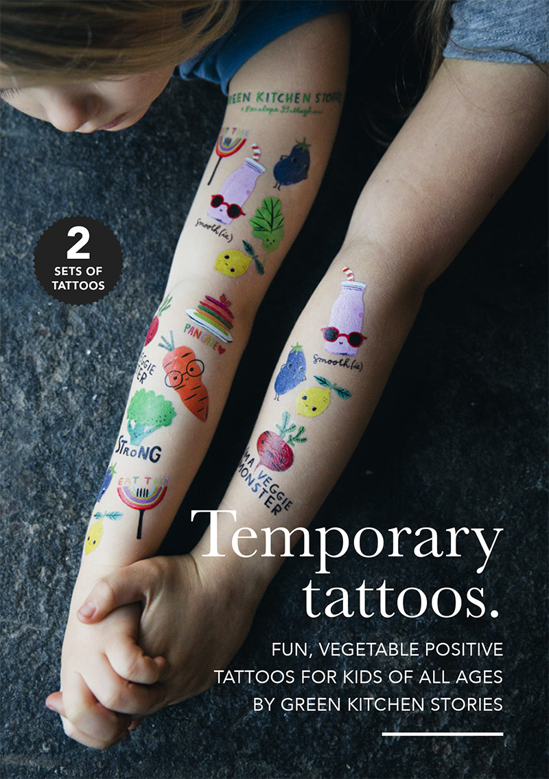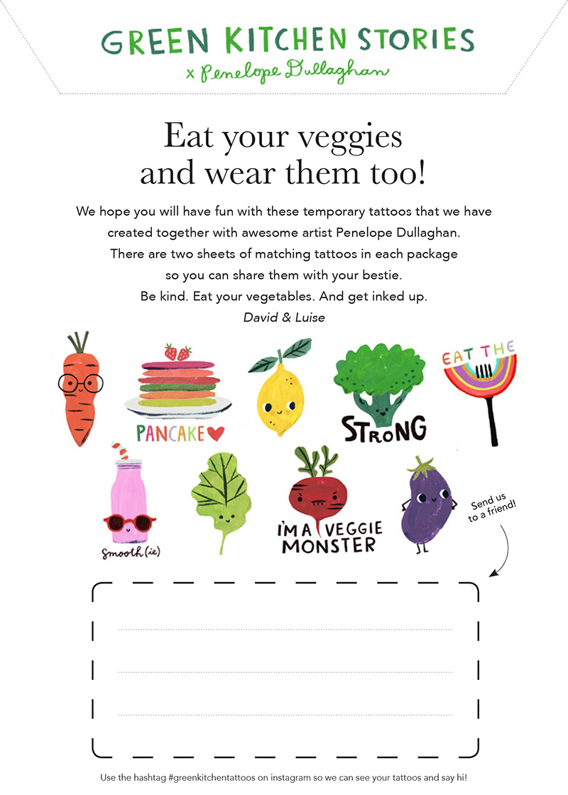 We have created these fun and playful temporary tattoos together with the fantastic artist Penelope Dullaghan to spread vegetable proudness among kids and adults. There are 9 super cute tattoos/characters on each sheet. The little beetroot veggie monster, rainbow pancake stack, cheeky eggplant, cute carrot, strong broccoli and a few more.