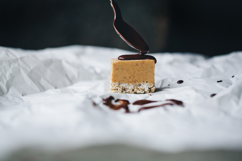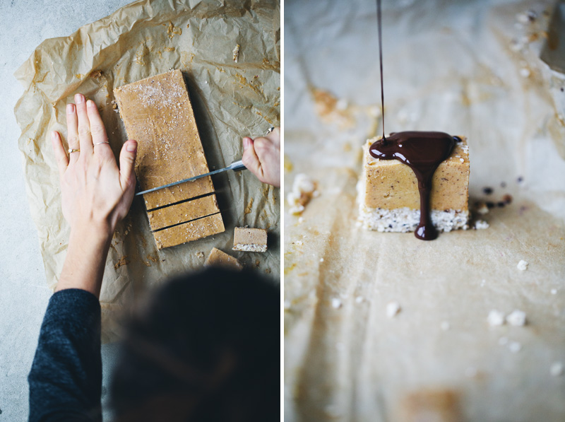We promised you a new recipe soon, and this one surely delivers. It’s a two layer, pumpkin pie caramel bar covered in dark chocolate. It takes a little jiggling to cover the bar in chocolate and some waiting for the pumpkin layer to set, but apart from that, it is pretty straight forward. Instead of making a separate caramel layer, we chose to combine our favourite date caramel recipe with a simple pumpkin pie recipe and it just made the whole thing a lot easier. And of course mega-delicious. When eaten straight from the freezer it has proper ice cream texture, and when left an hour in room temperature the inside gets more caramel-like. Personally, I prefer it somewhere in between – when the pumpkin caramel is a little soft but still quite frozen.