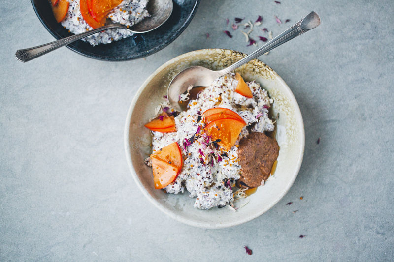 First time we tried quinoa bircher was at one of the many trendy Melbourne cafes, one year ago, and then again at Satan’s Coffee Corner (that name!) in Barcelona. We knew that we had stumbled over something great and have since then been experimenting with our own quinoa/buckwheat/oat bircher recipes. Simply explained, this bircher is made by mixing quick-cooked quinoa (making it more crunchy than mushy) with oats, yogurt (or coconut yogurt), vanilla and ginger. Then we top it with ripe persimmons, nut butter, bee pollen and these beautiful edible flower petals that we found at a local store. The result is a creamy and fresh breakfast that is super satisfying and really delicious. The petals actually taste surprisingly good – very flower-y – and suits this dish really well, but we mostly use them because they are pretty. If you can’t find any, feel free to make this dish without them.