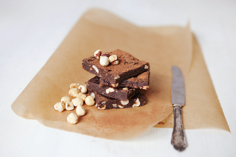 Place all ingredients, except the hazelnuts, in a food processor or a high speed blender. Mix until smooth, you probably have to scrape the mixture down with a spoon a couple of times. Add the chopped hazelnuts and knead the ‘dough’ by hand. Cover a brownie tin with plastic wrap and press down the dough to about 1/2 inch (1,25 cm) high. Rub a bit of coconut oil on your hands to prevent the dough from sticking. Put the cake in the fridge and let it set for a least half an hour. Cut in brownie-size pieces, dust with cacao powder and sprinkle with hazelnuts.