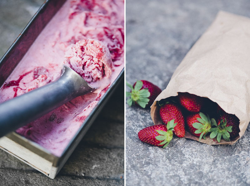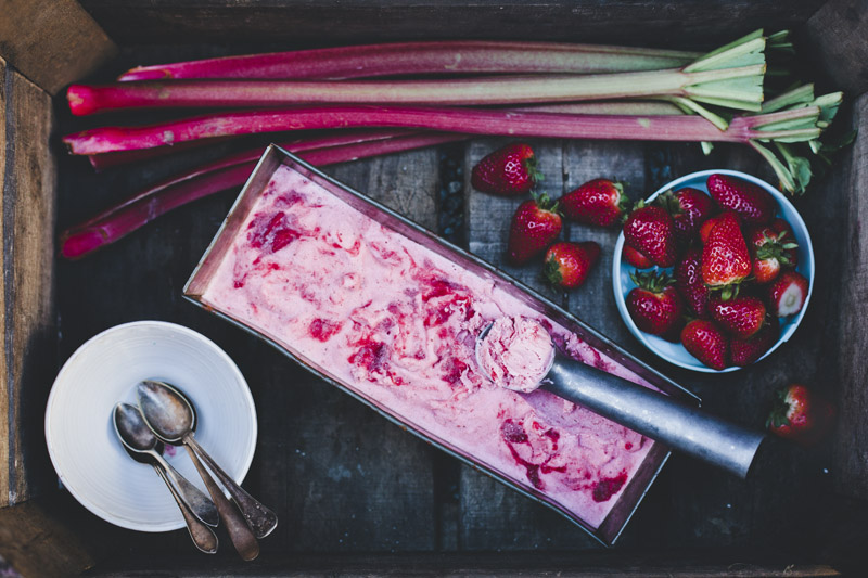I would love to say that ever since then, ice cream has had a special place in our hearts. But actually, I think my love affair with ice cream stopped when my love affair with Luise begun. Don’t get me wrong, we are still quite the ice cream eaters. But it’s not extreme anymore. We stick to the good stuff every once in a while. And when we do ice cream at home, we almost always make it yogurt-based. We have a really delicious coconut frozen yogurt recipe in our dessert app. With Summer around the corner, rhubarb and strawberries are starting to pop up everywhere. So we felt almost obliged to make a FroYo out of them.