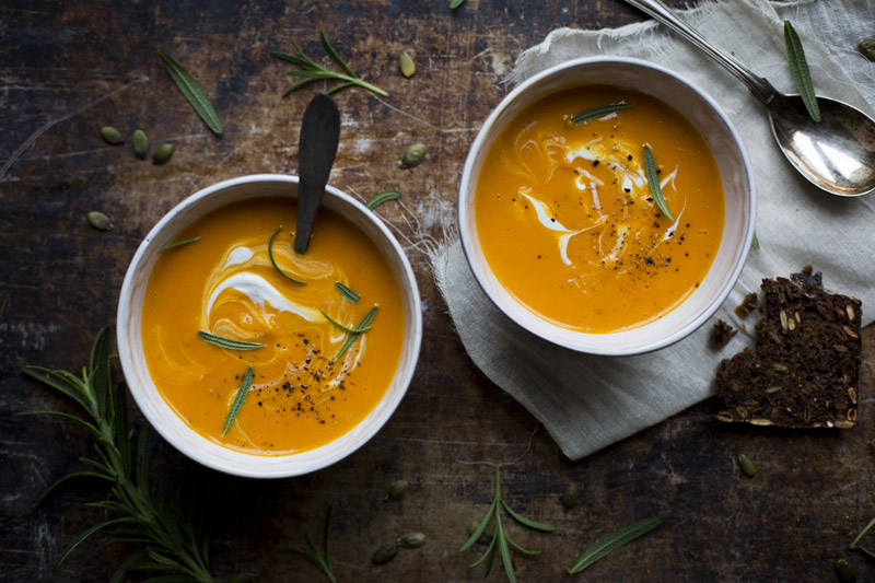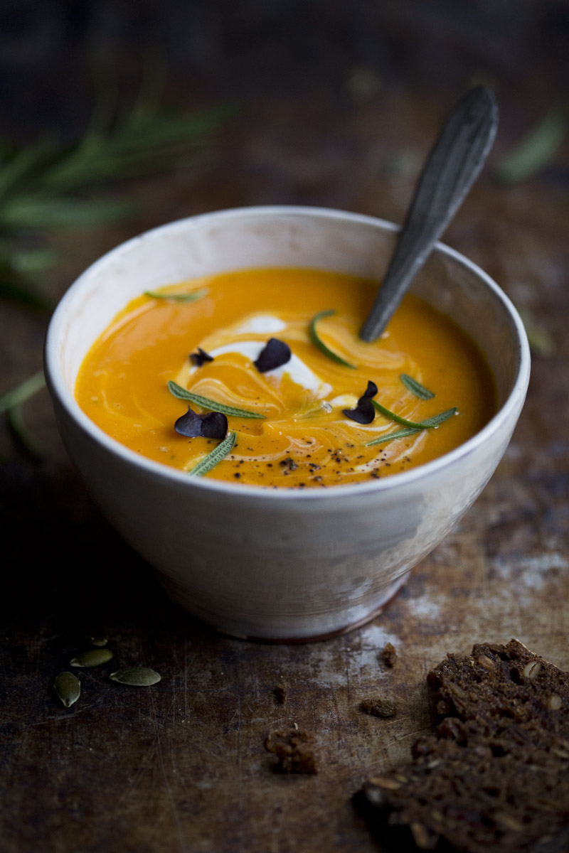 Roasted sweet potato, butternut squash and Hokkaido pumpkin are some of Elsa’s favorite foods. You can make this soup on any of those ingredients. We also add coconut milk, which gives it a velvet like consistency and very rich flavor. And ginger, rosemary and apple cider vinegar for a fresh twist. I imagine that a dash of white wine would also be nice.