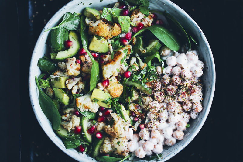 In this recipe, roasted cauliflower florets are sprinkled with za’atar and mixed into a fresh salad with avocado, spinach, parsley and cucumber slices and topped with small pomegranate jewels. It is served with creamy chickpeas drenched in yogurt and tahini and also sprinkled with za’atar. If pomegranate isn’t in season, it can be replaced with raisins (preferably yellow).