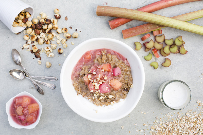 Place all ingredients in a medium pot and bring slowly to a boil. Lower the heat and cook for about 5-7 minutes, while stirring. Serve with warm rhubarb compote (see recipe below), vanilla whisked yogurt and roasted hazelnuts.