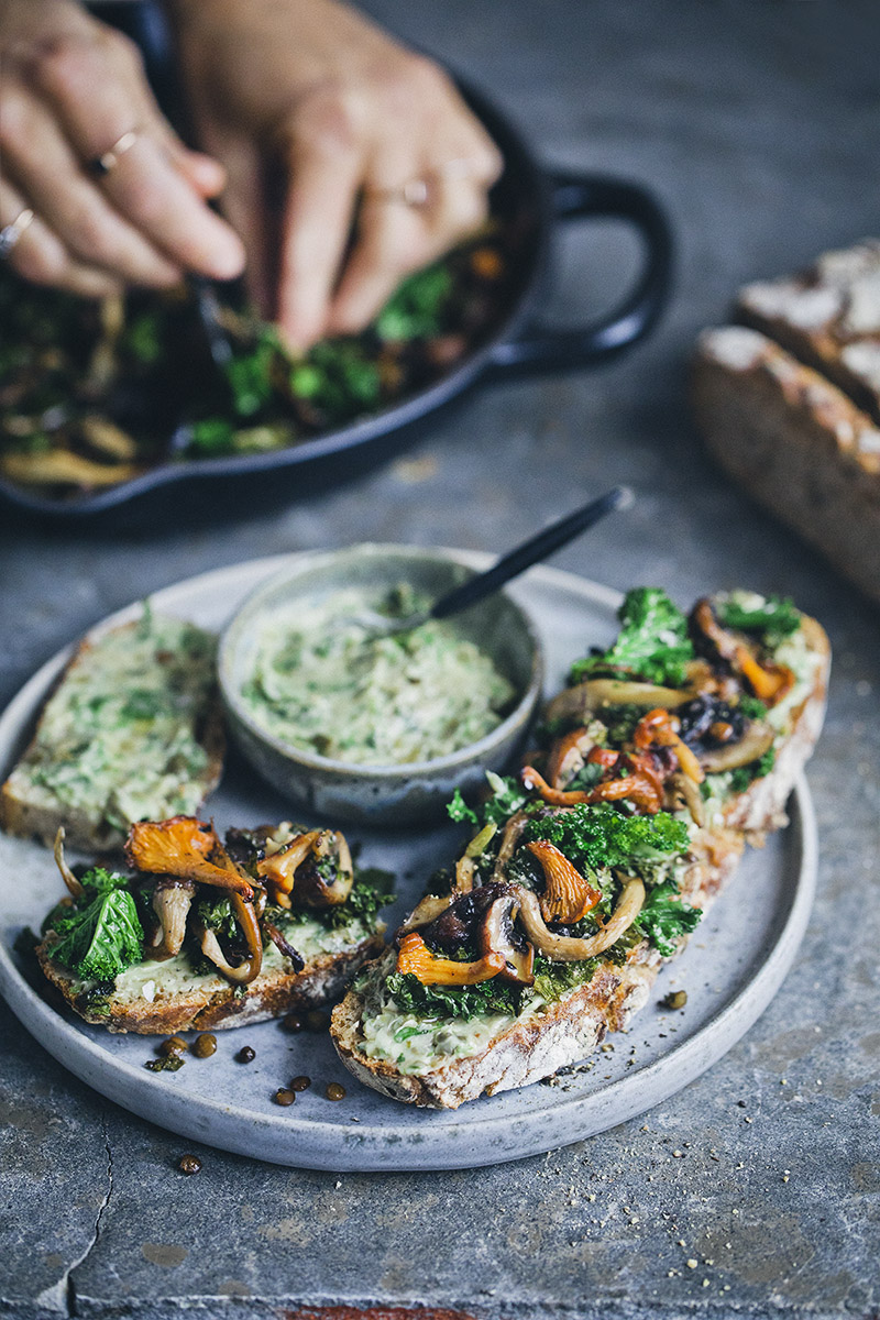 We have been using the bread for lunch sandwiches and this mushroom sandwich is our very favorite at the moment. It’s very very simple, you just fry mushrooms in a pan with a bit of garlic, fold down kale and cooked lentils and add a little vinegar to balance the flavors. We serve it with a herby vegan spread between the bread and the topping that we make from Zeta BreOliv, capers and parsley. BreOliv is a spreadable olive oil that can be used instead of butter. It is made from just olive oil, shea oil, water and salt. This recipe is sponsored by Zeta and you can find the recipe in Swedish on their site. And the English version below.