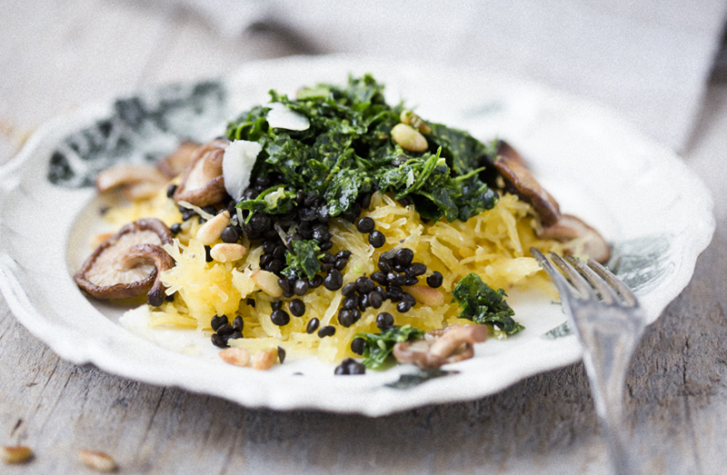 Spaghetti Squash with Beluga Lentils, Parsley Pesto & Shiitake